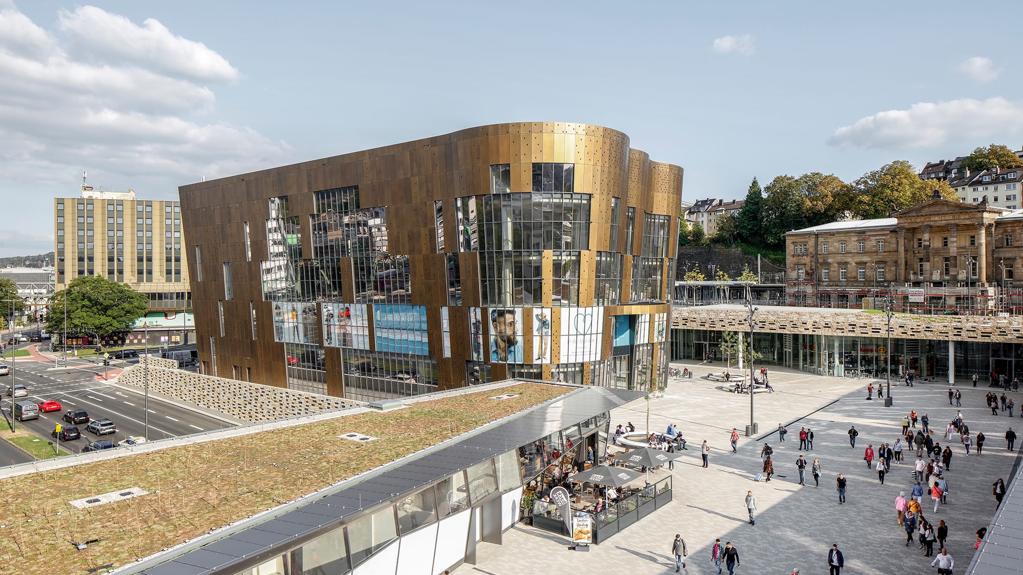 Die markante, geschwungene Gebäudeform greift mit seinen Rundungen spielerisch den Faltenwurf von Stoffen auf und schafft einen spannenden Dialog zum benachbarten Bahnhofsgebäude mit seiner streng formalen Fassade aus der Mitte des 19. Jahrhunderts. Der amorphe Solitär ist mit einer Metallfassade aus Kupferverbundelementen im Wechsel mit großformatigen Glasflächen verkleidet, wobei die Perforierungen der Metallelemente an eine Gewebestruktur erinnern und so das Thema Stoff erneut aufnehmen. Beim renommierten polis award, bei dem wegweisende städtebauliche Projekte ausgezeichnet werden, wurde das Projekt mit dem 1. Preis in der Kategorie „Reaktivierte Zentren“ ausgezeichnet. Die Jury würdigte mit dieser Auszeichnung das zentrale Stadtumbauprojekt als „einen herausragenden Beitrag für die Reaktivierung der Wuppertaler Innenstadt“.