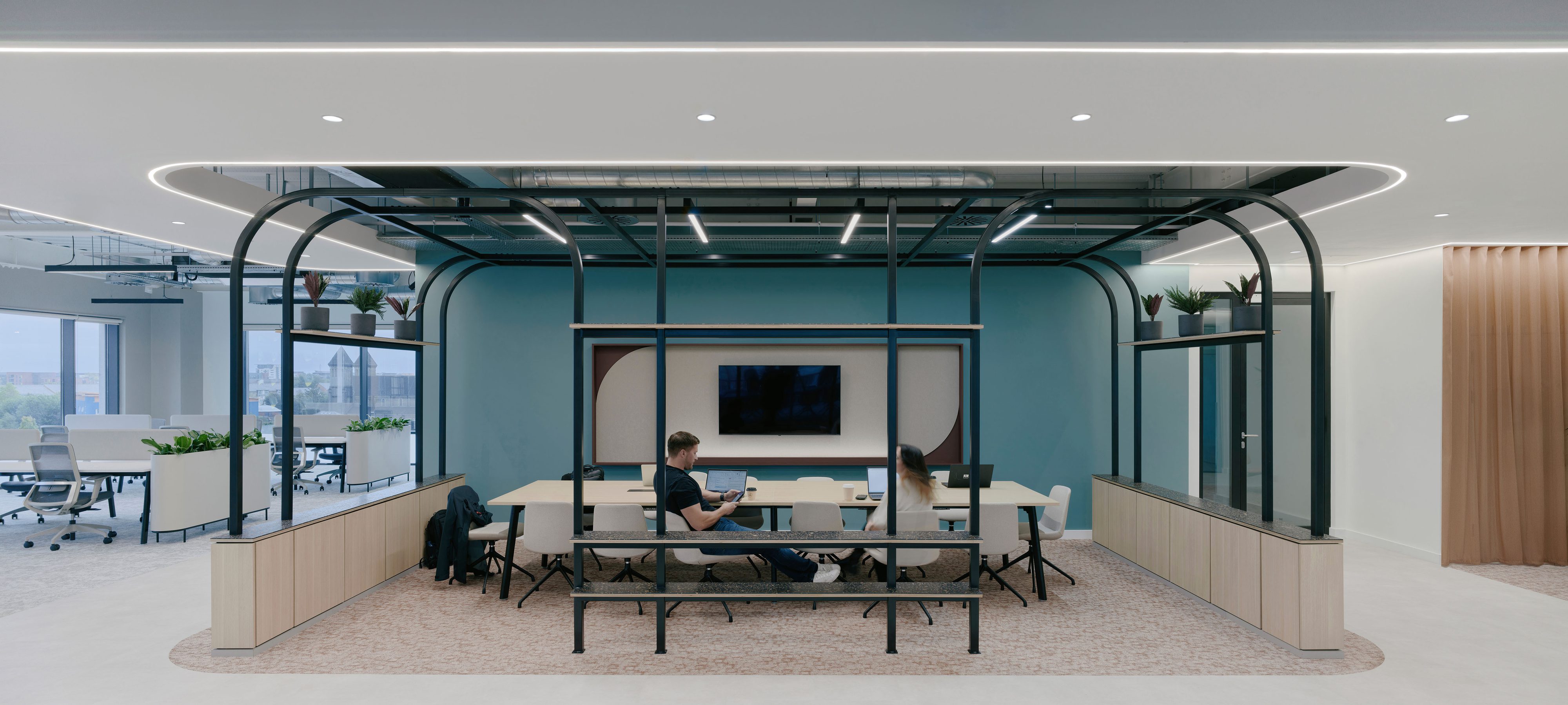 The design replaces the former maze of partitions with a light-filled, inclusive and adaptable environment that celebrates openness and collaboration. The arrival space dispenses with the formality of a traditional reception desk, instead offering a hospitality-inspired welcome area. Carefully defined zones provide spaces for meetings, focused work and social interaction, while a central teapoint acts as the social heart of the suite.