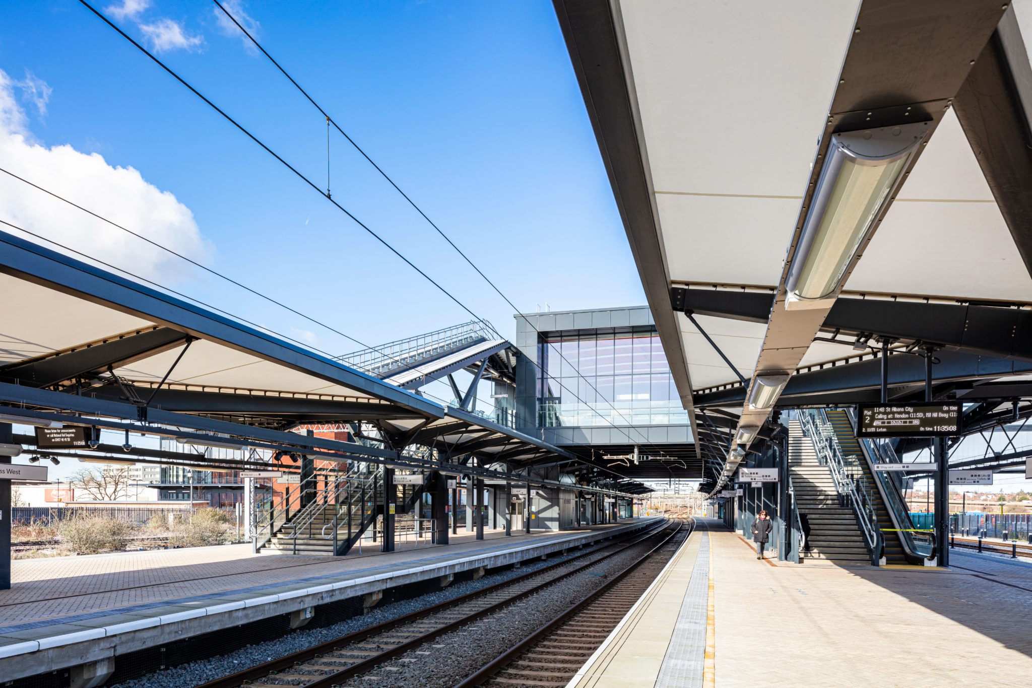 The station's eastern and western entrance buildings showcase distinctive architectural styles—one in brick, the other in cross-laminated timber. These structures lead seamlessly to the station's focal points: the striking overbridge constructions and the main station buildings, characterised by elegant light fabric canopies and roof structures.