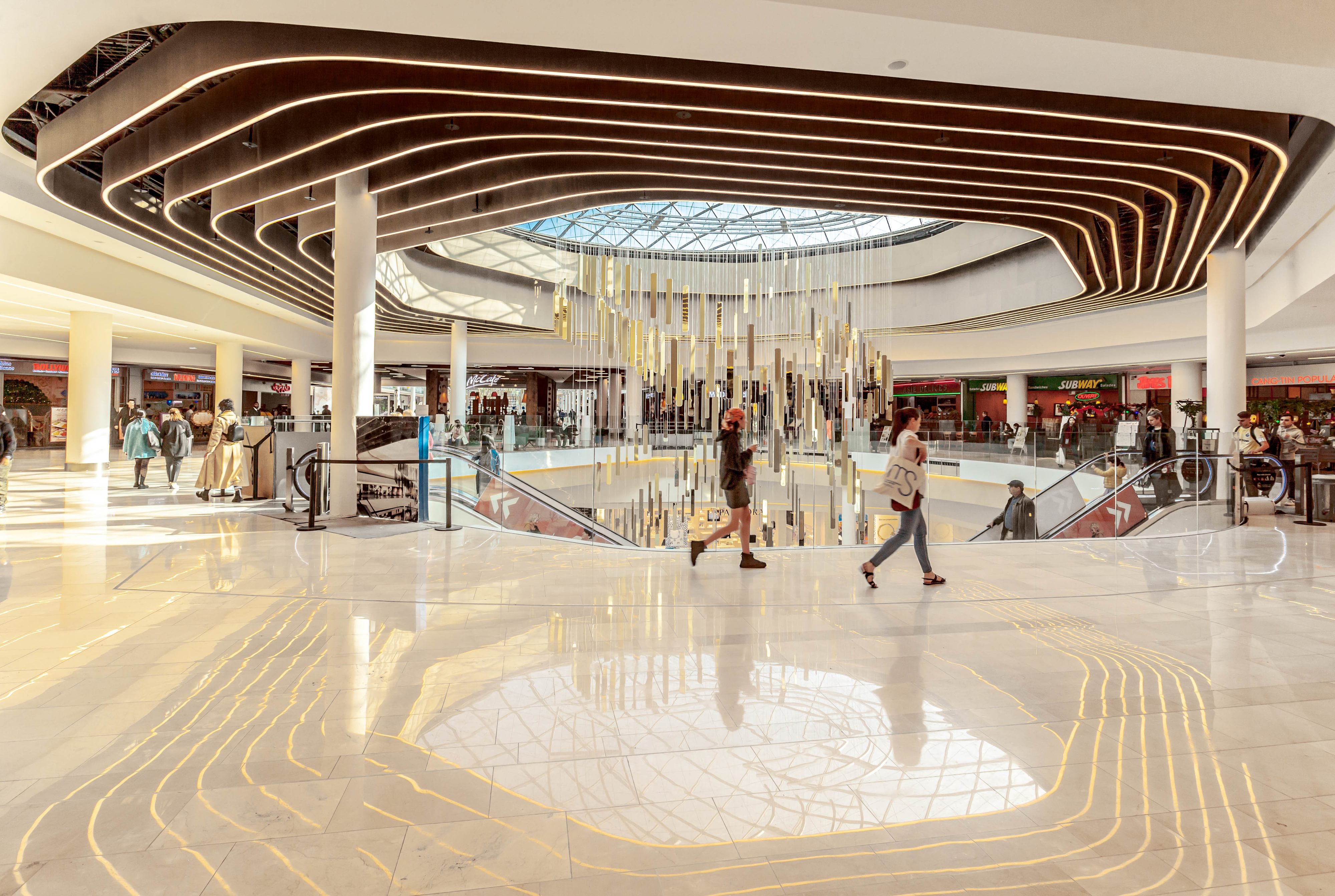 The revitalised centre now boasts 247 shops over two floors, one floor of F&B containing 57 restaurants, and 18 cinema rooms. The renovation budget was €50 million. Several spaces were completely reconfigured to provide a better atmosphere for shopping and natural lighting was improved by opening and modernising the existing skylights. Elegance and simplicity are reflected throughout, in the choice of flooring, balustrades and seating areas, for example.