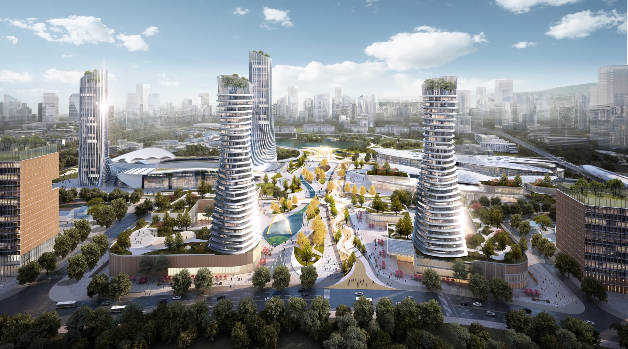 - Four signature tower buildings, two shopping centres and a commercial block, a pedestrian network, luxurious green parkland and lakeside amenities.